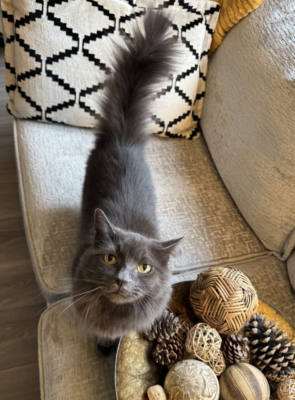 Rescued from uncertain origins under a plant pot, Dusty’s breed remains a mystery, though her appearance suggests a mix that resembles a Russian Blue. With a shorter tail compared to her siblings and a longer body, Dusty boasts a distinctive physique that adds to her allure.